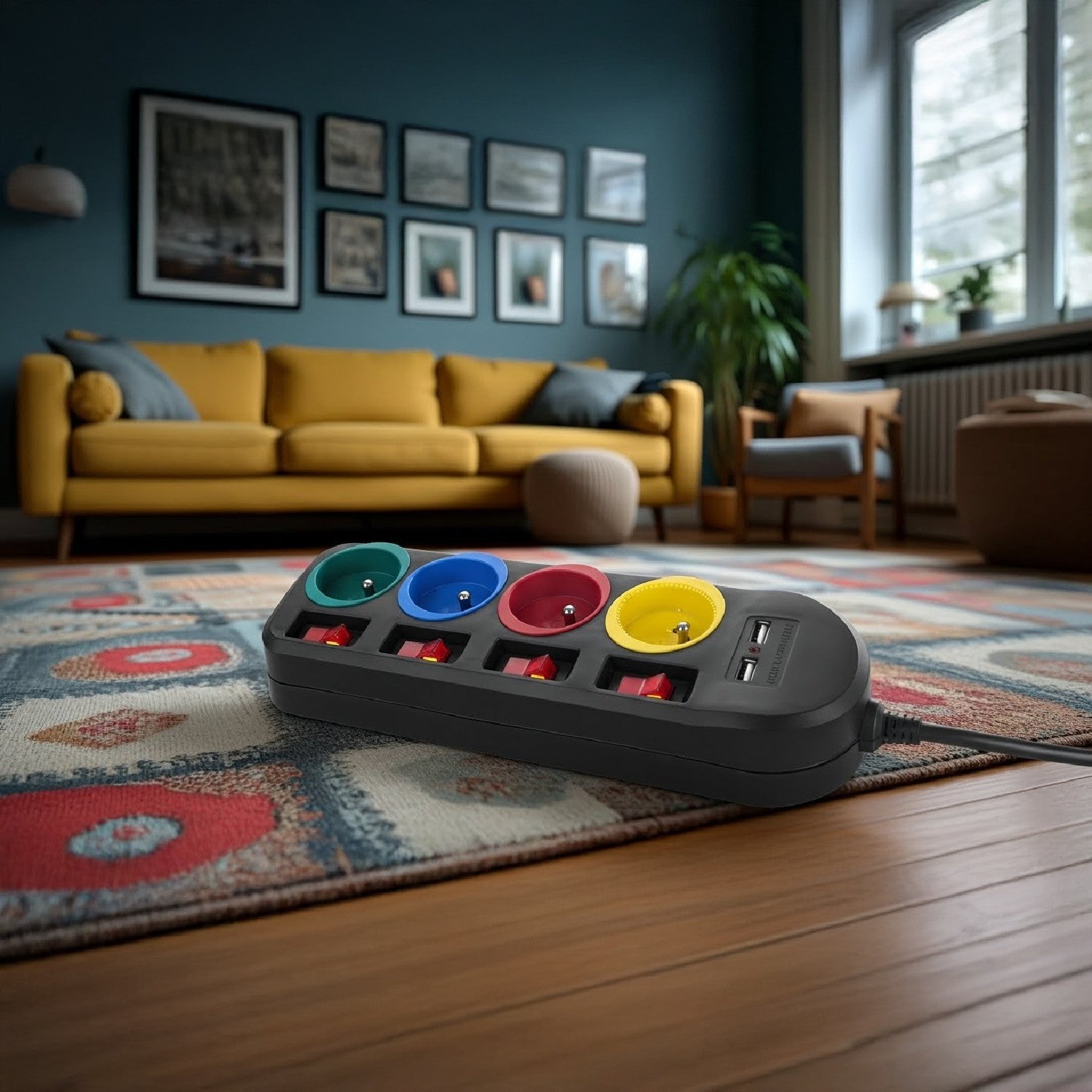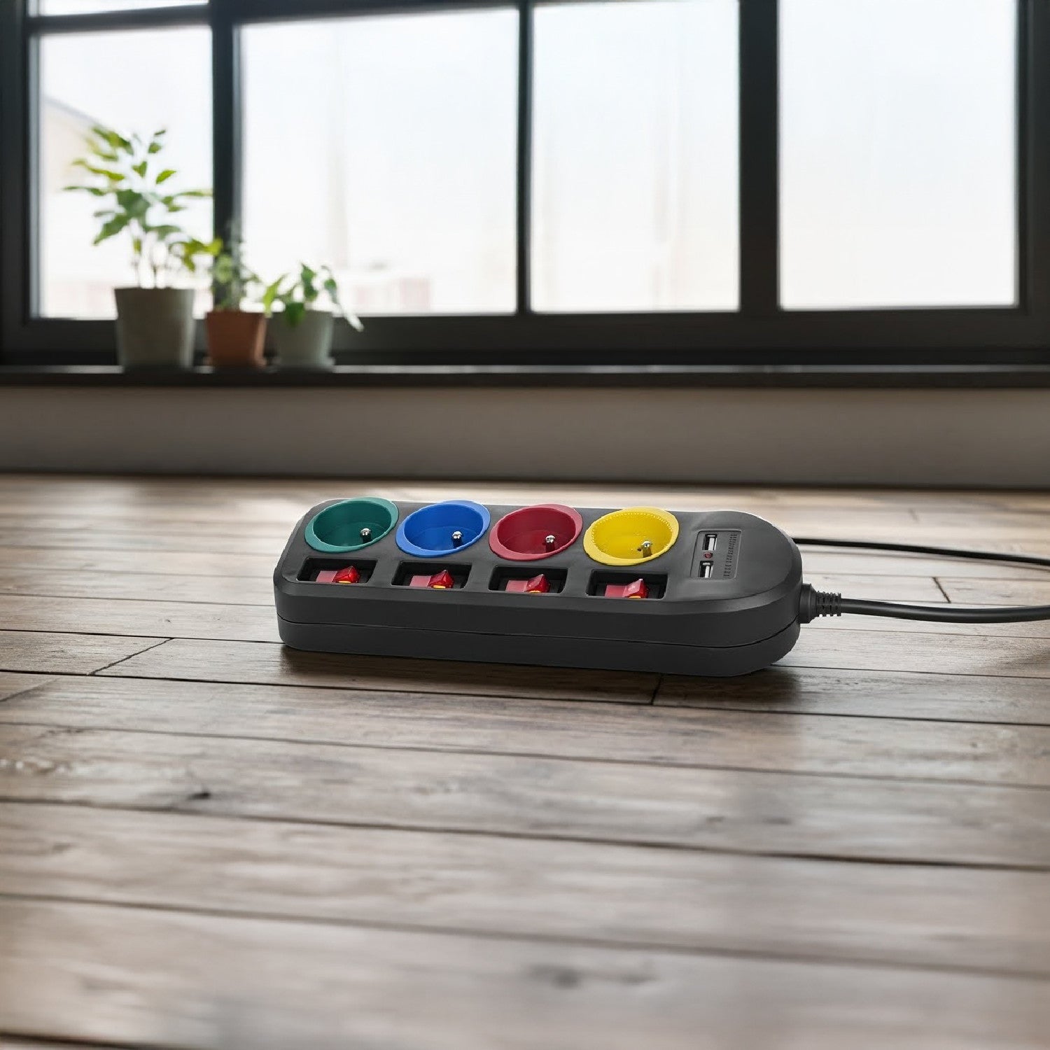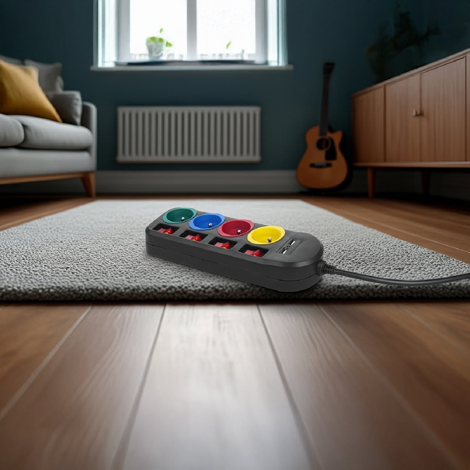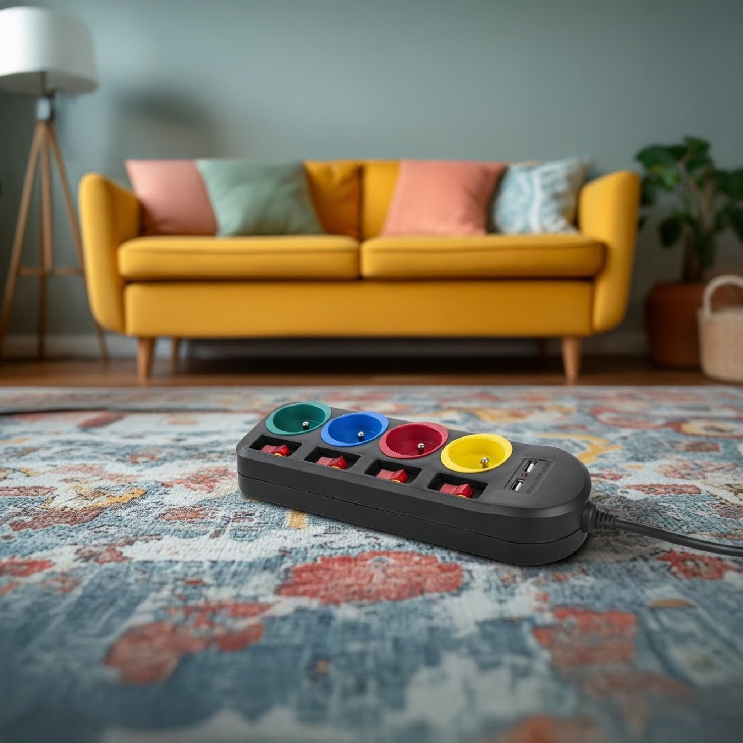 Listwa zasilająca z 4 gniazdami pozwala podłączyć równocześnie aż cztery pełnowymiarowe wtyczki. Wyposażona jest w zabezpieczenie przed dziećmi, osobne wyłączniki dla każdego gniazda oraz 2 porty USB umożliwiające ładowanie urządzeń takich jak smartfony, tablety, aparaty cyfrowe, itp.