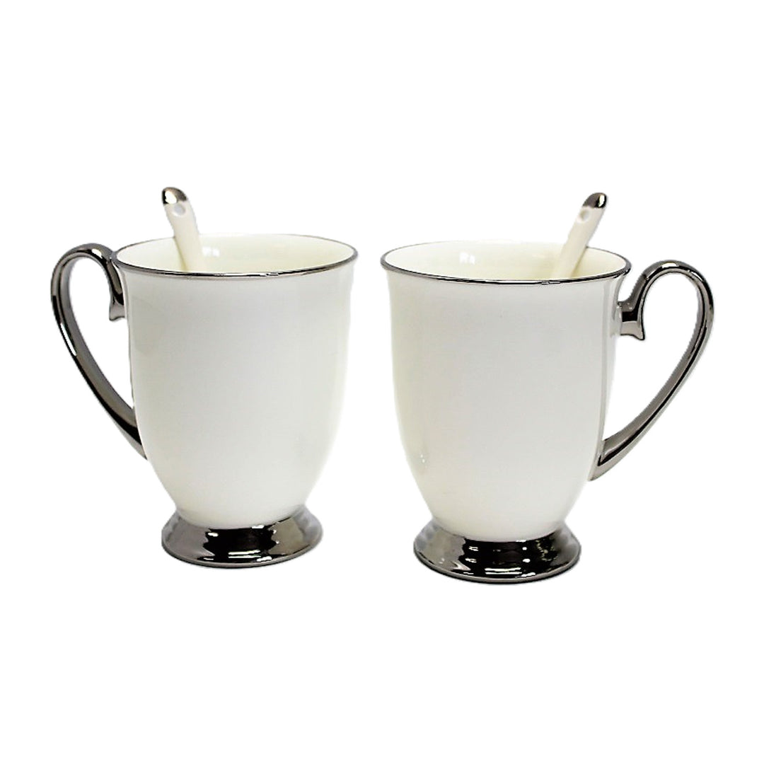 Kubki Białe 2szt Chromowane Uchwyty, Łyżeczki, Porcelana, Eleganckie, Queen Isabel