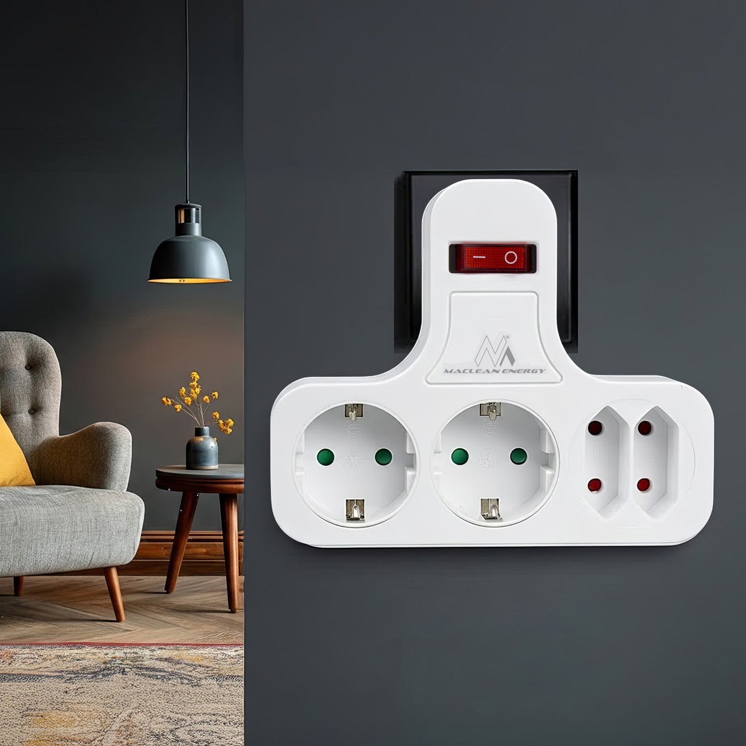 Gniazdko prądowe Maclean, Poczwórne z wyłącznikiem, Nóżką stabilizującą, Typu schuko, 2x2.5A, 2x16A, MCE224