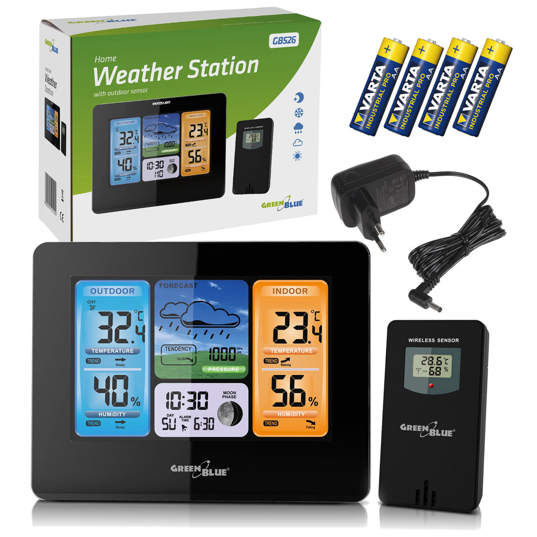 Stacja pogody bezprzewodowa GreenBlue, kolorowa, z systemem DCF, fazy księżyca, zasilacz, baterie, GB526