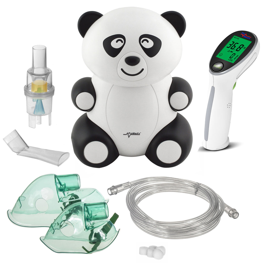 Inhalator dla dzieci Promedix PR-812 panda, zestaw nebulizator, maski, filterki + termometr lekarski bezdotykowy na podczerwień Promedix PR-960