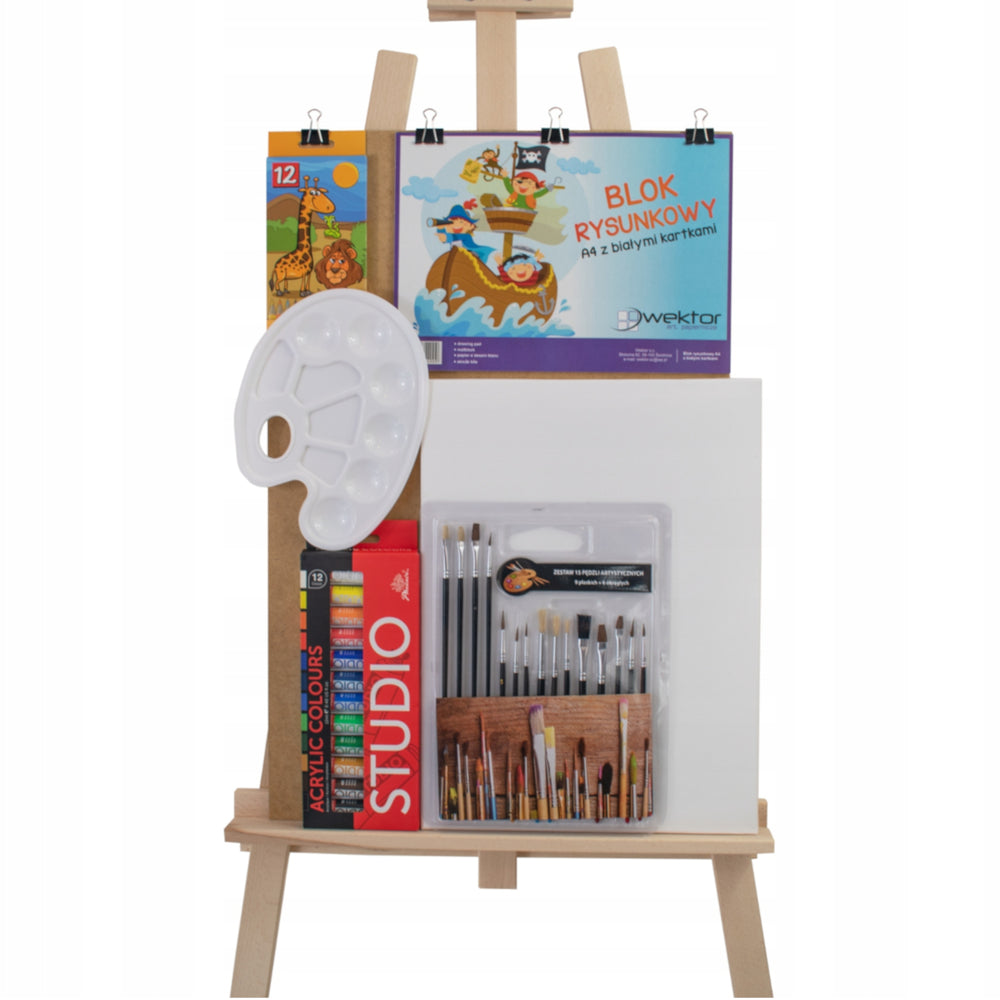 Duży, kompletny zestaw malarski - farby, pędzle, sztaluga