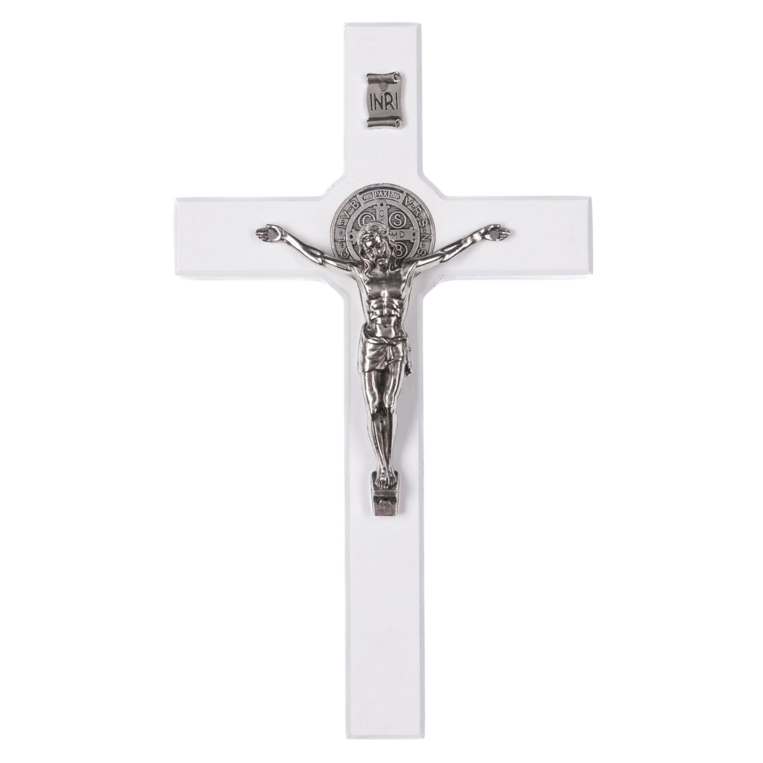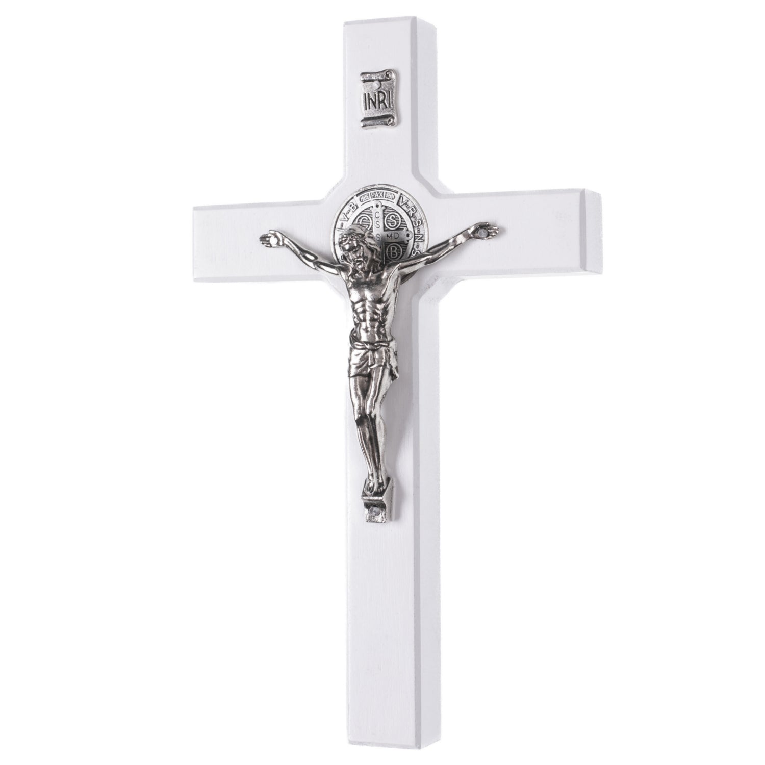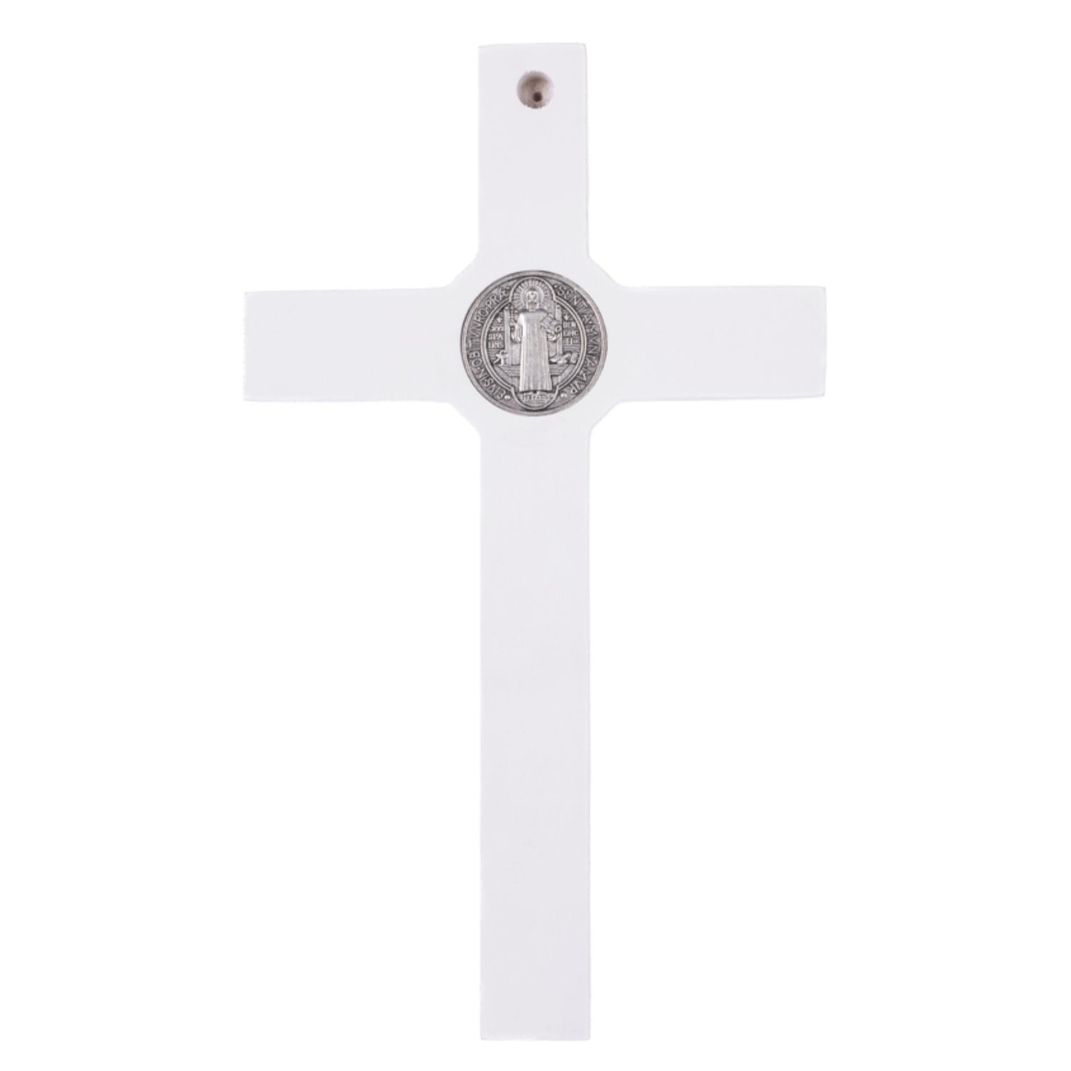 Drewniany krzyż św. Benedykta wiszący z pasyjką biały 22x12x1,8cm