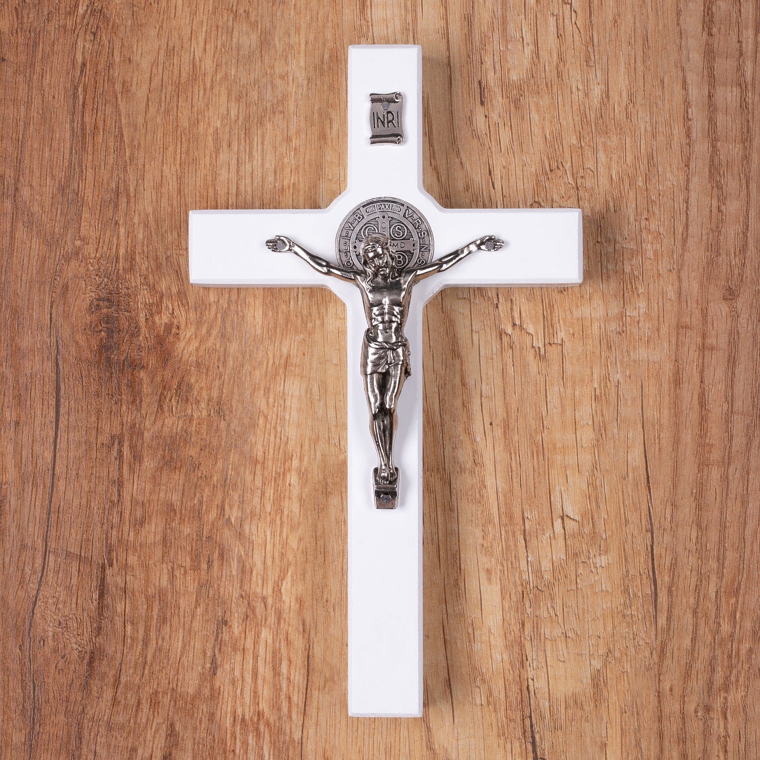 - Drewniany krzyż św. Benedykta wiszący z pasyjką biały 22x12x1,8cm