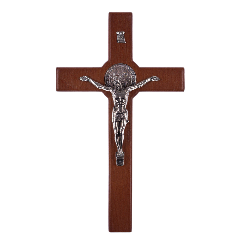 Drewniany krzyż św. Benedykta wiszący z pasyjką brąz 18x10x1,8cm