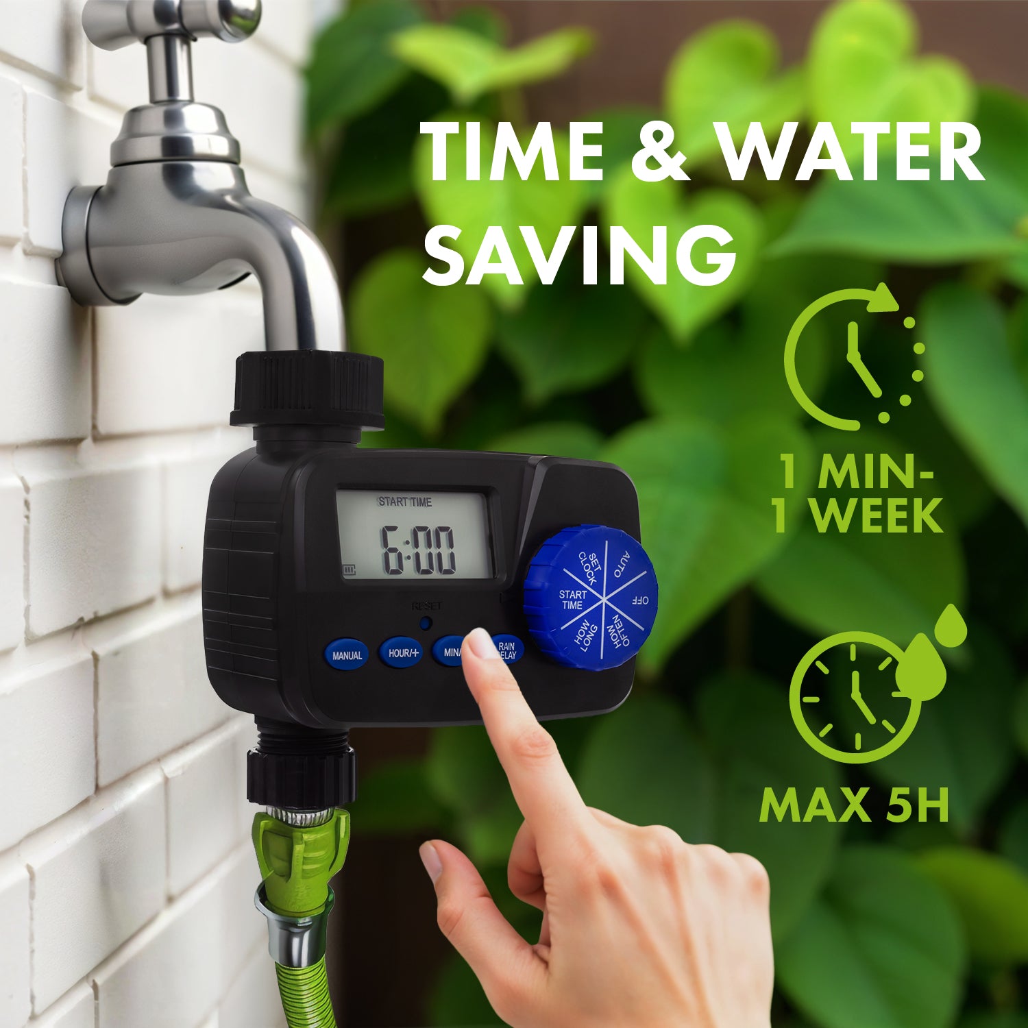 - regulacja czasu nawadniania – możliwość ustawienia długości cyklu podlewania w zakresie od 1 do 300 minut, co pozwala na precyzyjne dostosowanie ilości dostarczanej wody;